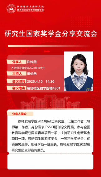 2024年国家奖学金获得者,2023级教育经济与管理专业硕士生许姝燕同学进行经验分享。