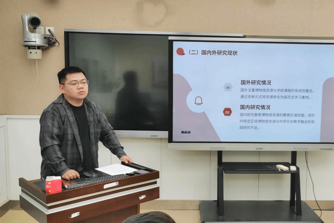 会上,白悦萌、卞润梓、张艳奎、赵慧四位同学依次对《新中国中学历史教科书知识体系建构研究》《博物馆资源与中学历史教育的深度融合研究——以陕西省为例》《历史教育中吐鲁番出土文书课程资源开发研究》《“大思政课”视域下项目式学习融入中学思政课教学的实践研究》等进行了开题汇报。汇报内容涵盖选题背景与意义、核心概念界定、研究思路与方法、预期成果规划等关键环节,既有对历史教育资源开发的一系列探索,也有对思政课程教学模式的创新性思考,充分展现研究者对基础教育热点问题的敏锐洞察与多维视角。
