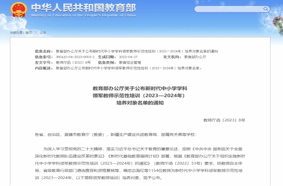 原文链接:教育部办公厅关于公布新时代中小学学科领军教师示范性培训(2023—2024年)培养对象名单的通知